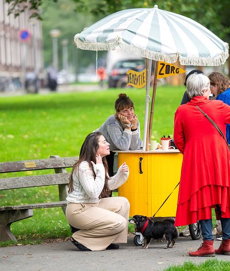 De karavaan is te herkennen aan de opvallende gele kar met blauw-witte parasol. De ene keer staat die bij een buurthuis, de andere keer in een park. Kunstenaar Jedidja Smalbil: “Soms denken mensen dat wij ijsjes verkopen, maar het wordt al snel duidelijk dat we een open gesprek aan willen gaan over de zorg.”